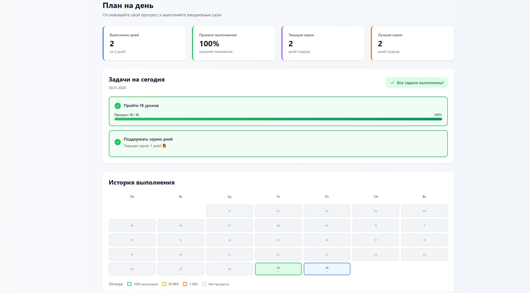 Также есть ежедневные задачи, минимум который нужно выполнять чтобы не потерять "серии дней", а дальше по желанию, что поддерживает в тонусе.