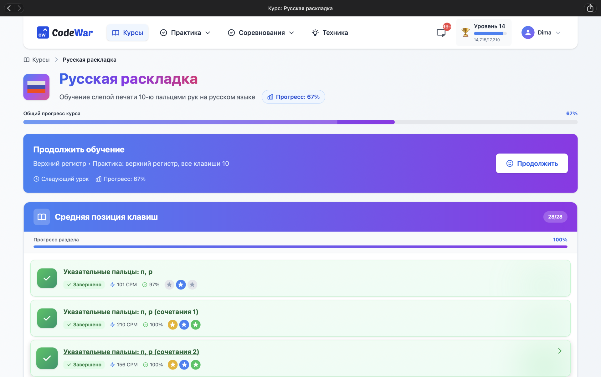 Отдельный плюс - система мотивации. Уровни, опыт и статистика по прогрессу реально помогают не забрасывать занятия. Видно, как растёт скорость и точность, и это держит в тонусе. Также полезно, что есть понятная теория по постановке рук и основам печати - пригодится даже тем, кто уже что-то умеет.
