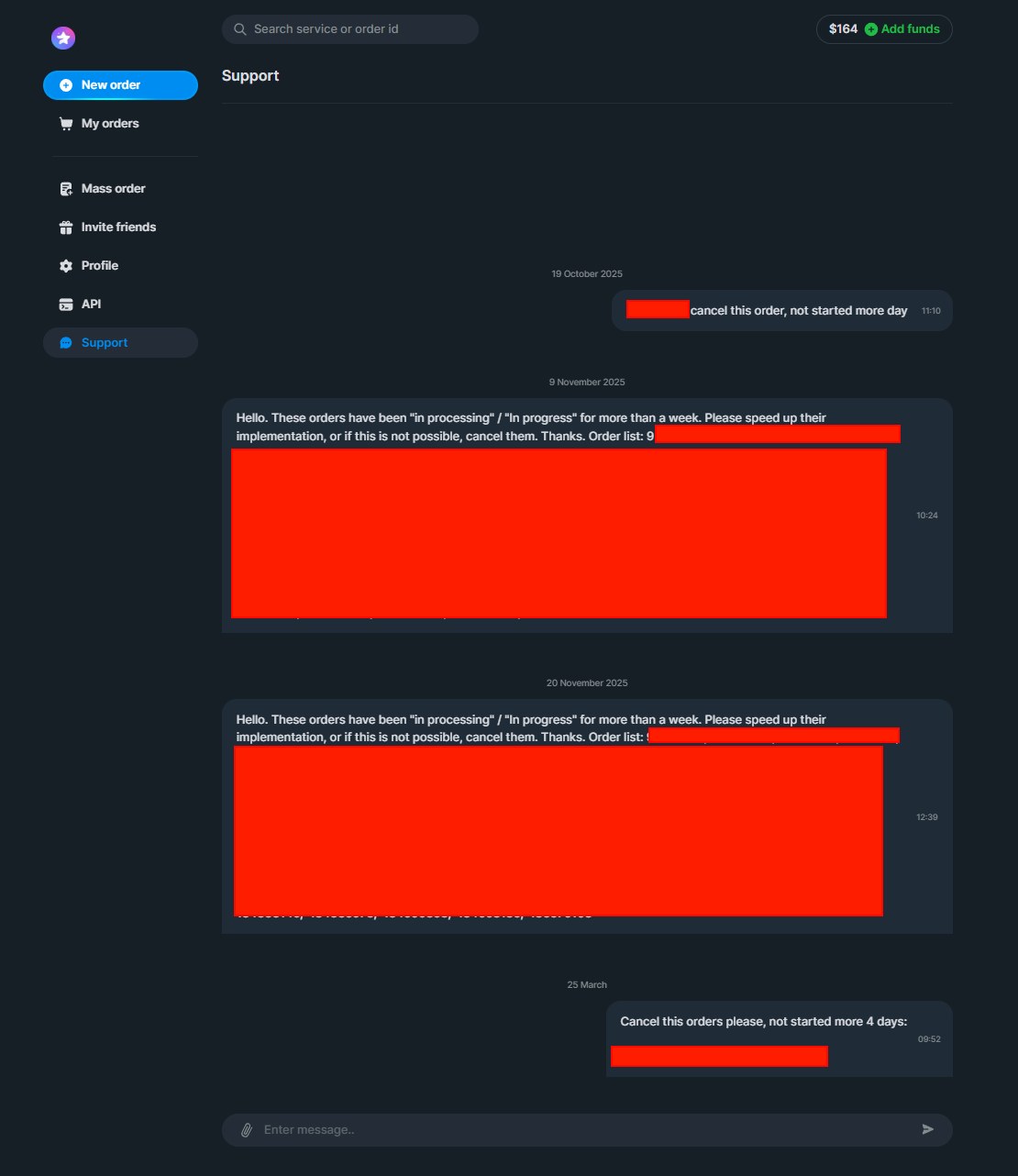 Пользуюсь сервисом давно, занимаясь ресейлом услуг. Большинство услуг отрабатывают стабильно, но когда случаются проблемы что услуга не стартует более недели, заказы больших объёмов, пишу в поддержку - полный игнор, за всё время ни разу не получал ответа от поддержки в telegrampremium. Клиентам, соответственно, приходится отменять заказы и возвращать средства за свой счёт (и уже не важно выполняется заказ, или нет, спустя неделю срока клиента кормить "завтраками" и портить репутацию своего сервиса не вариант).